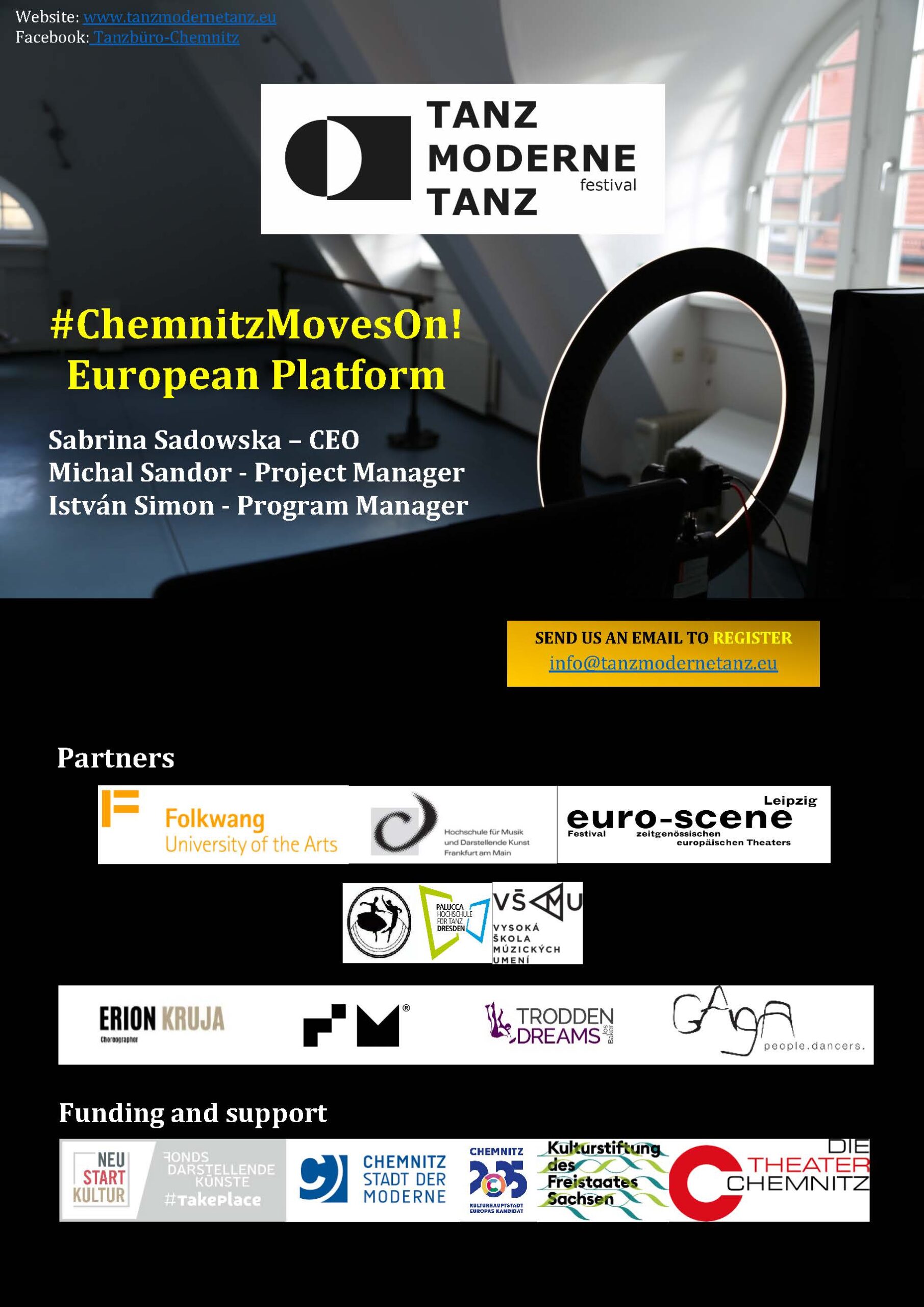 The “#ChemnitzMovesOn!” is a European Platform for exchange, workshops, and masterclasses for European Dance Institutions to provide for their students and graduates skills, knowledge, and competence of styles and techniques that shape European dance.